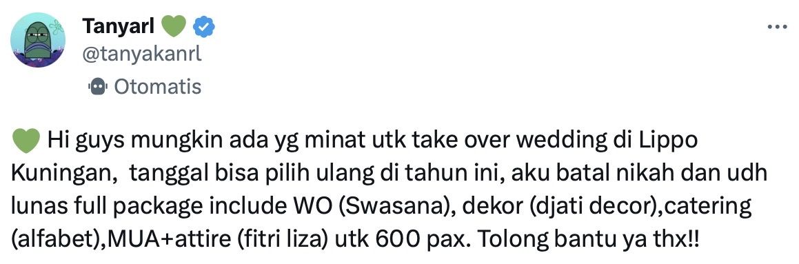 Melalui akun twitter @tanyakanrl, “Hi guys mungkin ada yg minat utk take over wedding di Lippo Kuningan, tanggal bisa pilih ulang di tahun ini, aku batal nikah dan udh lunas full package include WO (Swasana), dekor (djati decor),catering (alfabet),MUA+attire (fitri liza) utk 600 pax. Tolong bantu ya thx!!”